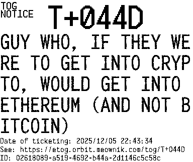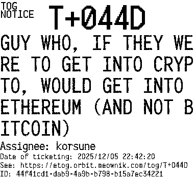 Orbit eTOG Listing Service: T+044D GUY WHO, IF THEY WERE TO GET INTO CRYPTO, WOULD GET INTO ETHEREUM (AND NOT BITCOIN)