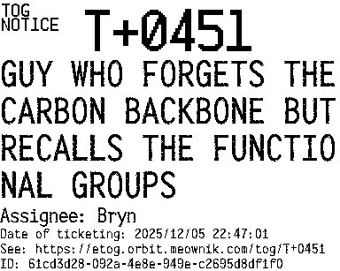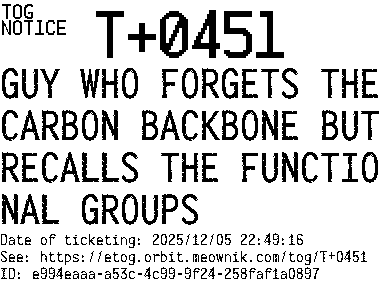 Orbit eTOG Listing Service: T+0451 GUY WHO FORGETS THE CARBON BACKBONE BUT RECALLS THE FUNCTIONAL GROUPS