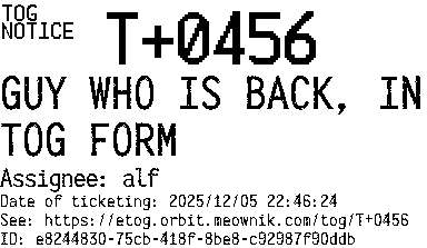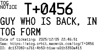 Orbit eTOG Listing Service: T+0456 GUY WHO IS BACK, IN TOG FORM