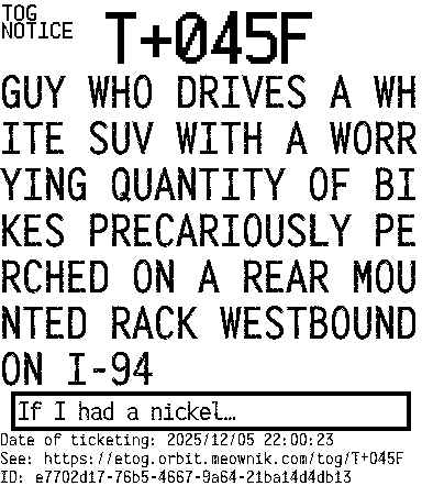 Orbit eTOG Listing Service: T+045F GUY WHO DRIVES A WHITE SUV WITH A WORRYING QUANTITY OF BIKES PRECARIOUSLY PERCHED ON A REAR MOUNTED RACK WESTBOUND ON I-94