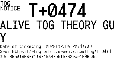Orbit eTOG Listing Service: T+0474 ALIVE TOG THEORY GUY