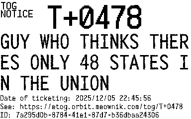Orbit eTOG Listing Service: T+0478 GUY WHO THINKS THERES ONLY 48 STATES IN THE UNION