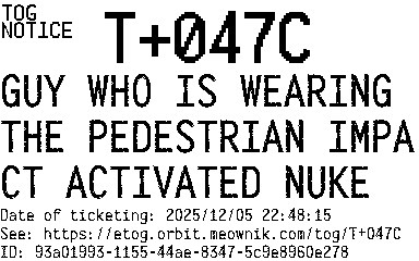 Orbit eTOG Listing Service: T+047C GUY WHO IS WEARING THE PEDESTRIAN IMPACT ACTIVATED NUKE