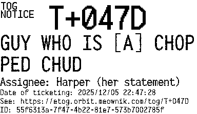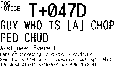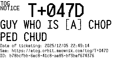 Orbit eTOG Listing Service: T+047D GUY WHO IS [A] CHOPPED CHUD
