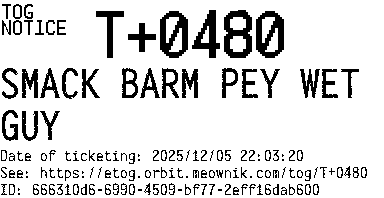 Orbit eTOG Listing Service: T+0480 SMACK BARM PEY WET GUY