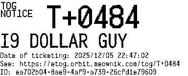 Orbit eTOG Listing Service: T+0484 I9 DOLLAR GUY
