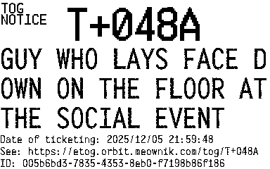 Orbit eTOG Listing Service: T+048A GUY WHO LAYS FACE DOWN ON THE FLOOR AT THE SOCIAL EVENT