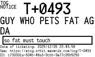 Orbit eTOG Listing Service: T+0493 GUY WHO PETS FAT AGDA
