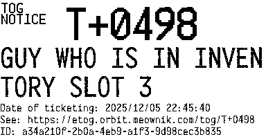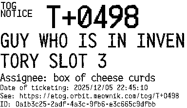 Orbit eTOG Listing Service: T+0498 GUY WHO IS IN INVENTORY SLOT 3