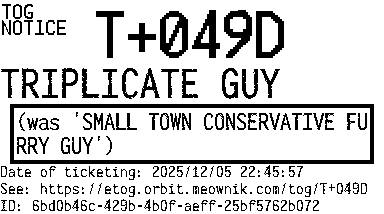 Orbit eTOG Listing Service: T+049D TRIPLICATE GUY