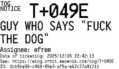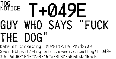 Orbit eTOG Listing Service: T+049E GUY WHO SAYS "FUCK THE DOG"