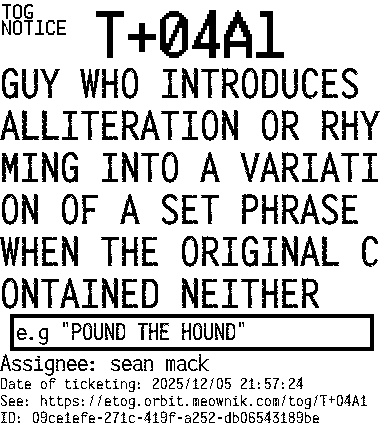 Orbit eTOG Listing Service: T+04A1 GUY WHO INTRODUCES ALLITERATION OR RHYMING INTO A VARIATION OF A SET PHRASE WHEN THE ORIGINAL CONTAINED NEITHER