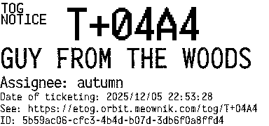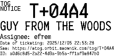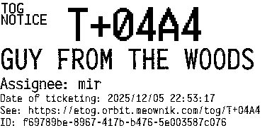 Orbit eTOG Listing Service: T+04A4 GUY FROM THE WOODS