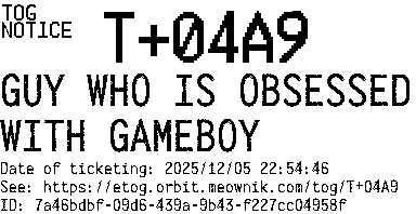 Orbit eTOG Listing Service: T+04A9 GUY WHO IS OBSESSED WITH GAMEBOY