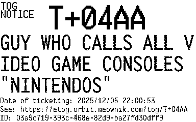 Orbit eTOG Listing Service: T+04AA GUY WHO CALLS ALL VIDEO GAME CONSOLES "NINTENDOS"