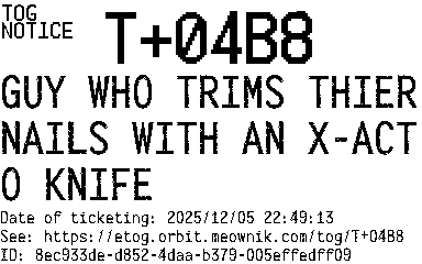Orbit eTOG Listing Service: T+04B8 GUY WHO TRIMS THIER NAILS WITH AN X-ACTO KNIFE
