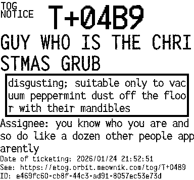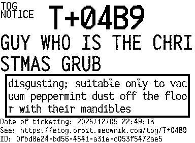Orbit eTOG Listing Service: T+04B9 GUY WHO IS THE CHRISTMAS GRUB