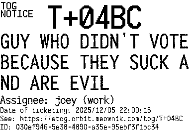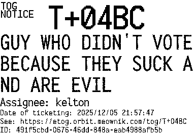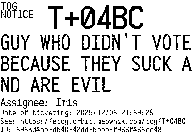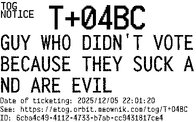 Orbit eTOG Listing Service: T+04BC GUY WHO DIDN'T VOTE BECAUSE THEY SUCK AND ARE EVIL