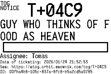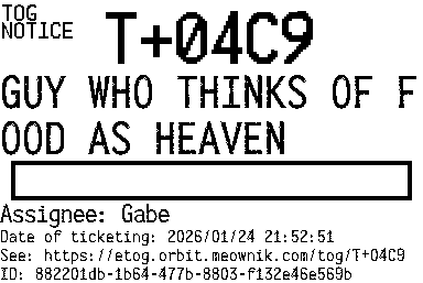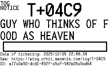 Orbit eTOG Listing Service: T+04C9 GUY WHO THINKS OF FOOD AS HEAVEN