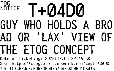 Orbit eTOG Listing Service: T+04D0 GUY WHO HOLDS A BROAD OR 'LAX' VIEW OF THE ETOG CONCEPT