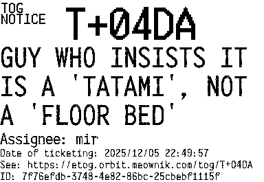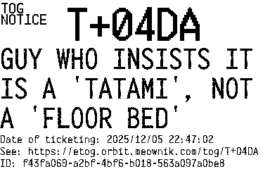 Orbit eTOG Listing Service: T+04DA GUY WHO INSISTS IT IS A 'TATAMI', NOT A 'FLOOR BED'