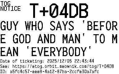 Orbit eTOG Listing Service: T+04DB GUY WHO SAYS 'BEFORE GOD AND MAN' TO MEAN 'EVERYBODY'