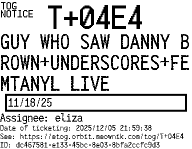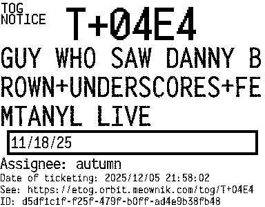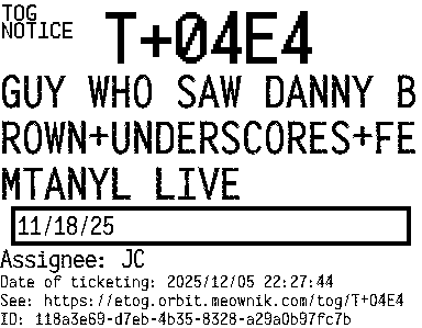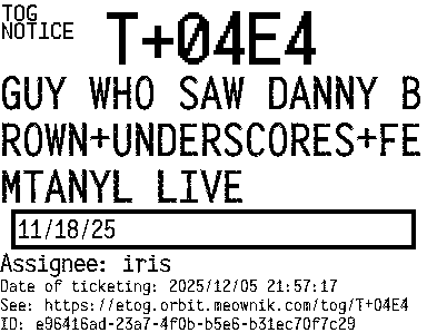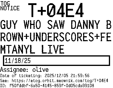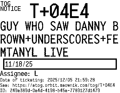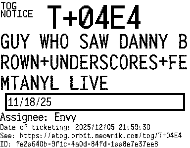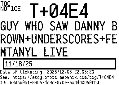 Orbit eTOG Listing Service: T+04E4 GUY WHO SAW DANNY BROWN+UNDERSCORES+FEMTANYL LIVE