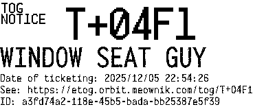 Orbit eTOG Listing Service: T+04F1 WINDOW SEAT GUY