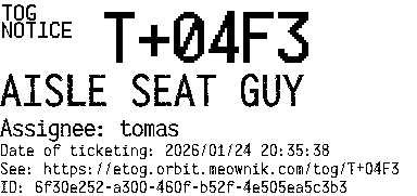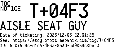 Orbit eTOG Listing Service: T+04F3 AISLE SEAT GUY
