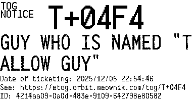 Orbit eTOG Listing Service: T+04F4 GUY WHO IS NAMED "TALLOW GUY"