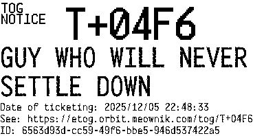 Orbit eTOG Listing Service: T+04F6 GUY WHO WILL NEVER SETTLE DOWN