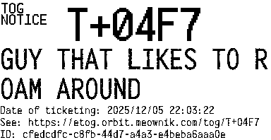 Orbit eTOG Listing Service: T+04F7 GUY THAT LIKES TO ROAM AROUND