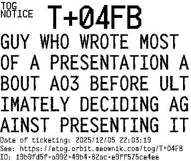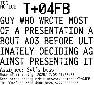 Orbit eTOG Listing Service: T+04FB GUY WHO WROTE MOST OF A PRESENTATION ABOUT AO3 BEFORE ULTIMATELY DECIDING AGAINST PRESENTING IT