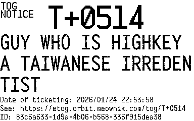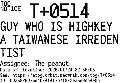 Orbit eTOG Listing Service: T+0514 GUY WHO IS HIGHKEY A TAIWANESE IRREDENTIST