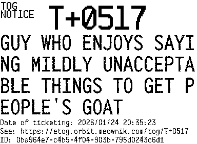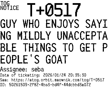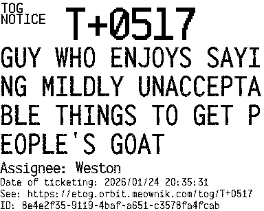 Orbit eTOG Listing Service: T+0517 GUY WHO ENJOYS SAYING MILDLY UNACCEPTABLE THINGS TO GET PEOPLE'S GOAT