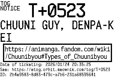 Orbit eTOG Listing Service: T+0523 CHUUNI GUY, DENPA-KEI
