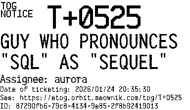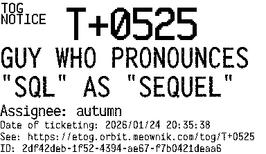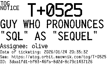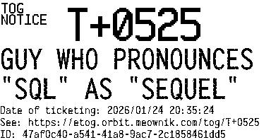 Orbit eTOG Listing Service: T+0525 GUY WHO PRONOUNCES "SQL" AS "SEQUEL"