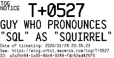 Orbit eTOG Listing Service: T+0527 GUY WHO PRONOUNCES "SQL" AS "SQUIRREL"