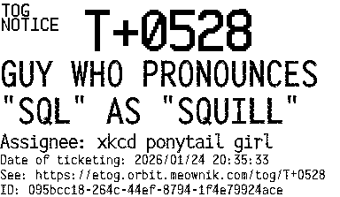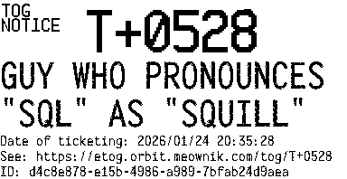 Orbit eTOG Listing Service: T+0528 GUY WHO PRONOUNCES "SQL" AS "SQUILL"