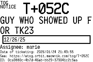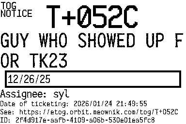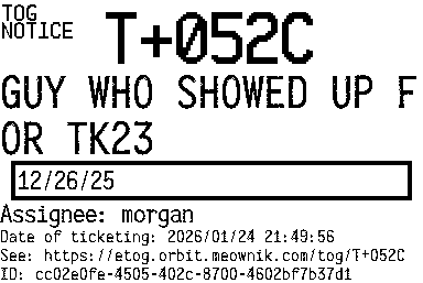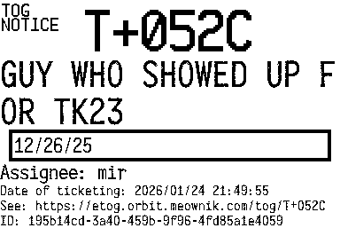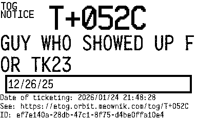 Orbit eTOG Listing Service: T+052C GUY WHO SHOWED UP FOR TK23
