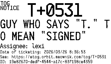 Orbit eTOG Listing Service: T+0531 GUY WHO SAYS "T." TO MEAN "SIGNED"