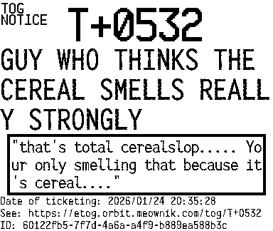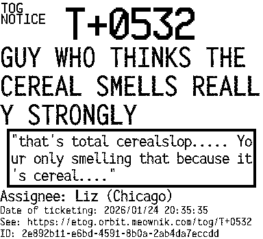 Orbit eTOG Listing Service: T+0532 GUY WHO THINKS THE CEREAL SMELLS REALLY STRONGLY