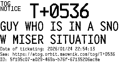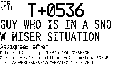 Orbit eTOG Listing Service: T+0536 GUY WHO IS IN A SNOW MISER SITUATION