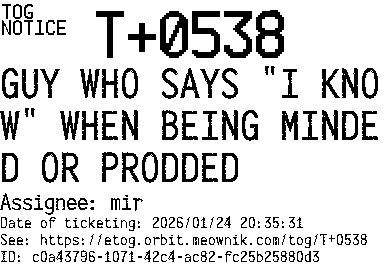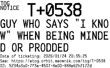 Orbit eTOG Listing Service: T+0538 GUY WHO SAYS "I KNOW" WHEN BEING MINDED OR PRODDED
