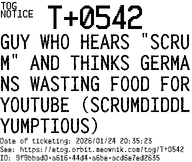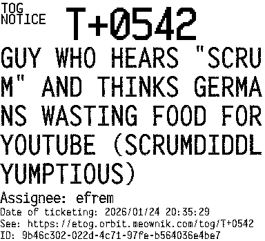 Orbit eTOG Listing Service: T+0542 GUY WHO HEARS "SCRUM" AND THINKS GERMANS WASTING FOOD FOR YOUTUBE (SCRUMDIDDLYUMPTIOUS)