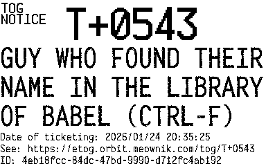 Orbit eTOG Listing Service: T+0543 GUY WHO FOUND THEIR NAME IN THE LIBRARY OF BABEL (CTRL-F)