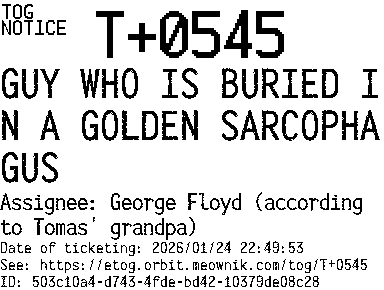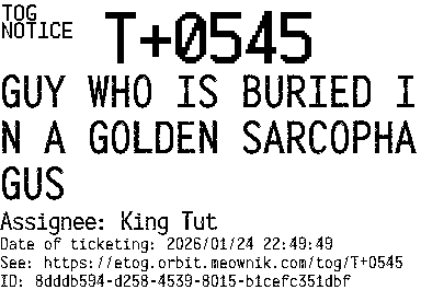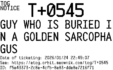 Orbit eTOG Listing Service: T+0545 GUY WHO IS BURIED IN A GOLDEN SARCOPHAGUS