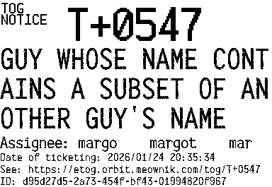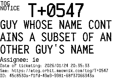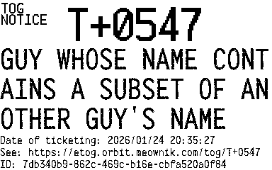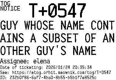 Orbit eTOG Listing Service: T+0547 GUY WHOSE NAME CONTAINS A SUBSET OF ANOTHER GUY'S NAME