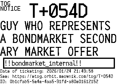 Orbit eTOG Listing Service: T+054D GUY WHO REPRESENTS A BONDMARKET SECONDARY MARKET OFFER