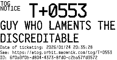 Orbit eTOG Listing Service: T+0553 GUY WHO LAMENTS THE DISCREDITABLE